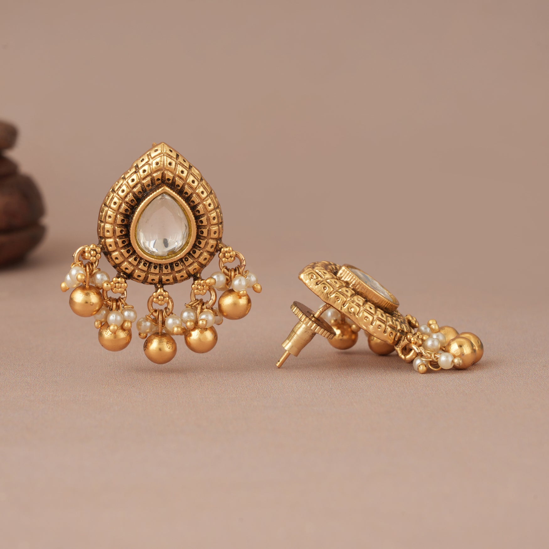 Stunning ball drop kundan antique gold earring is made of brass alloy with gold plating. These studs are 1.2 inches long, and the lock is push back.