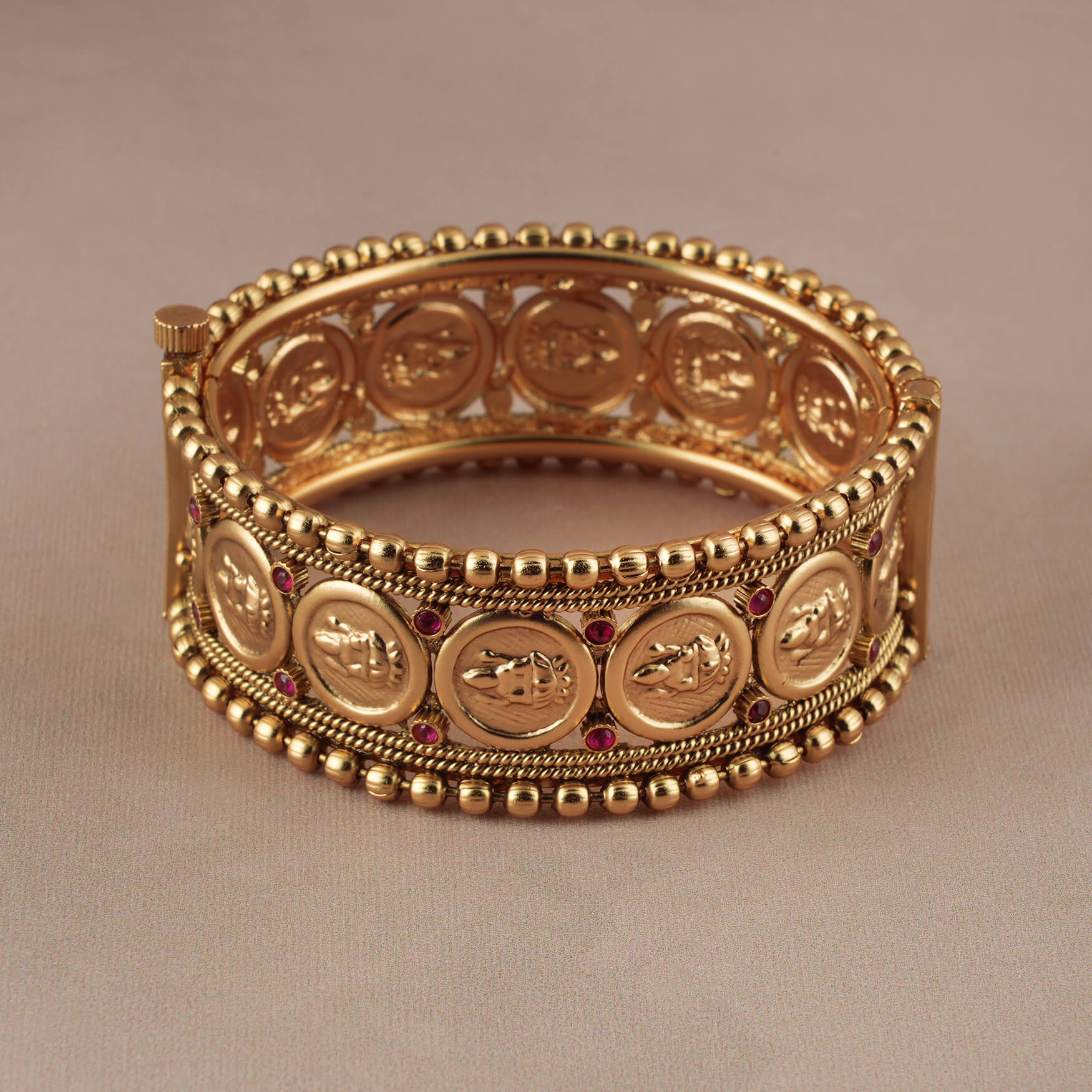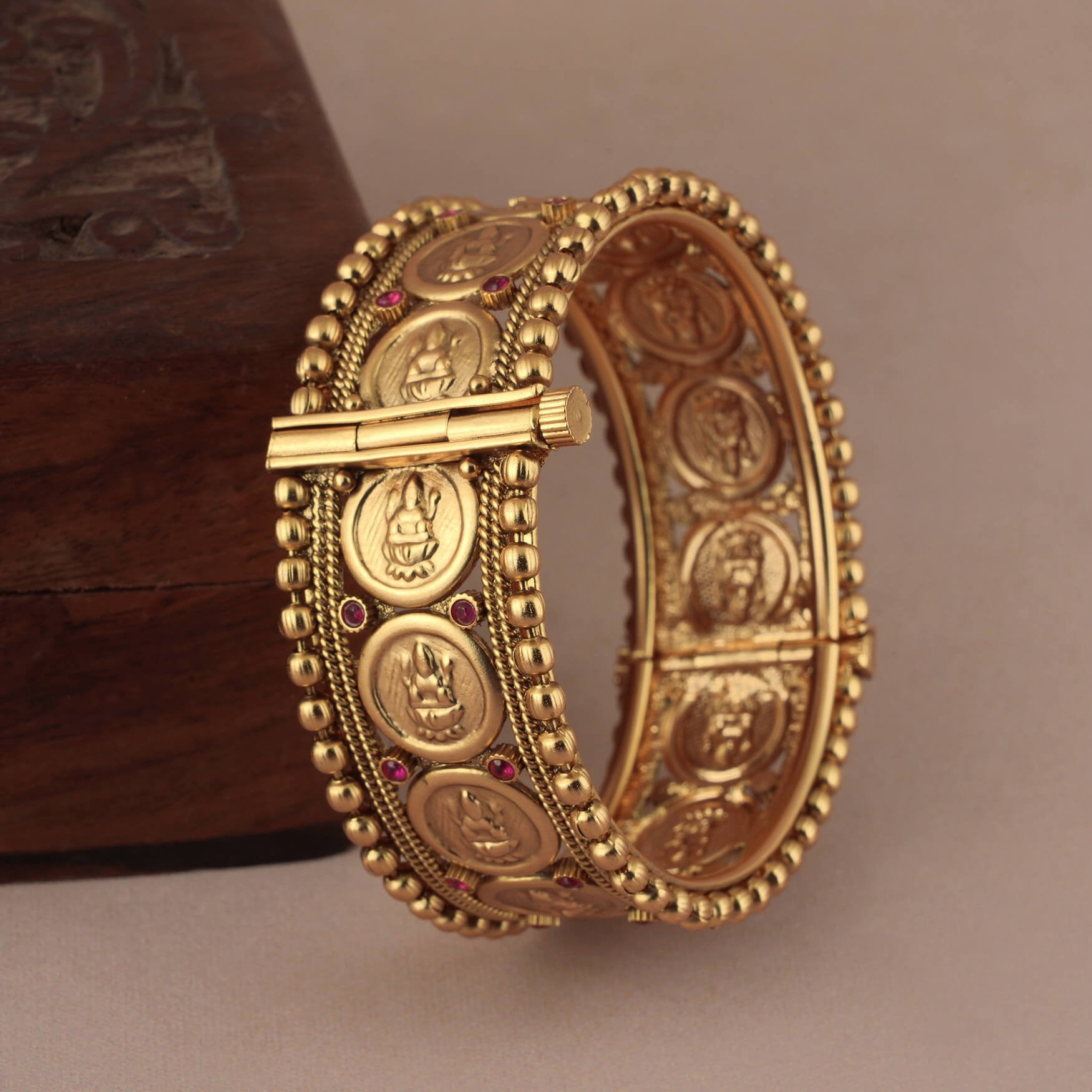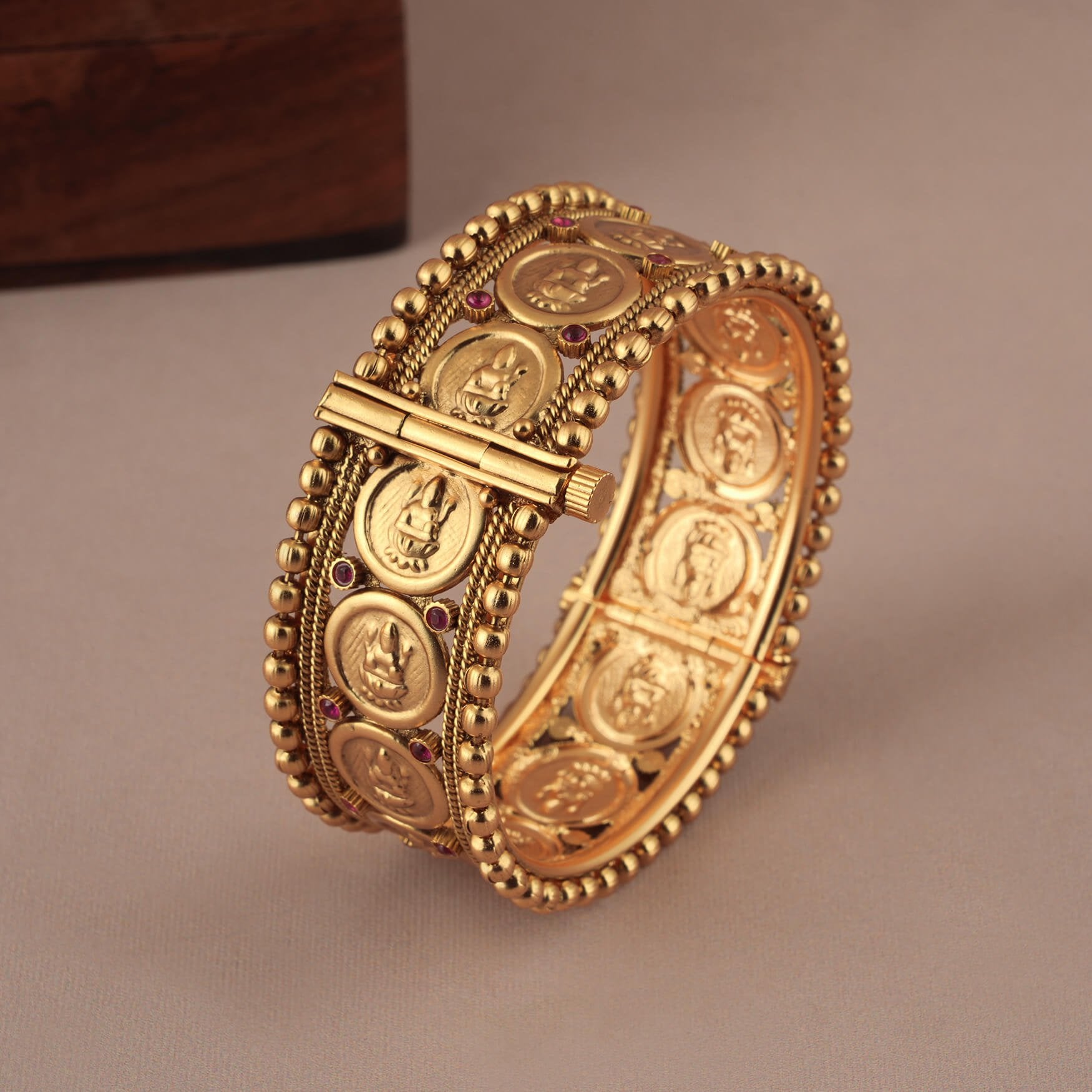 NOTE: This Stunning broad antique gold stone openable kada been crafted by hand and may have slight irregularities or imperfections in color or embellishment. These irregularities are the result of human involvement in the process and add to the finished product's charm while ensuring you have a one-of-a-kind piece.