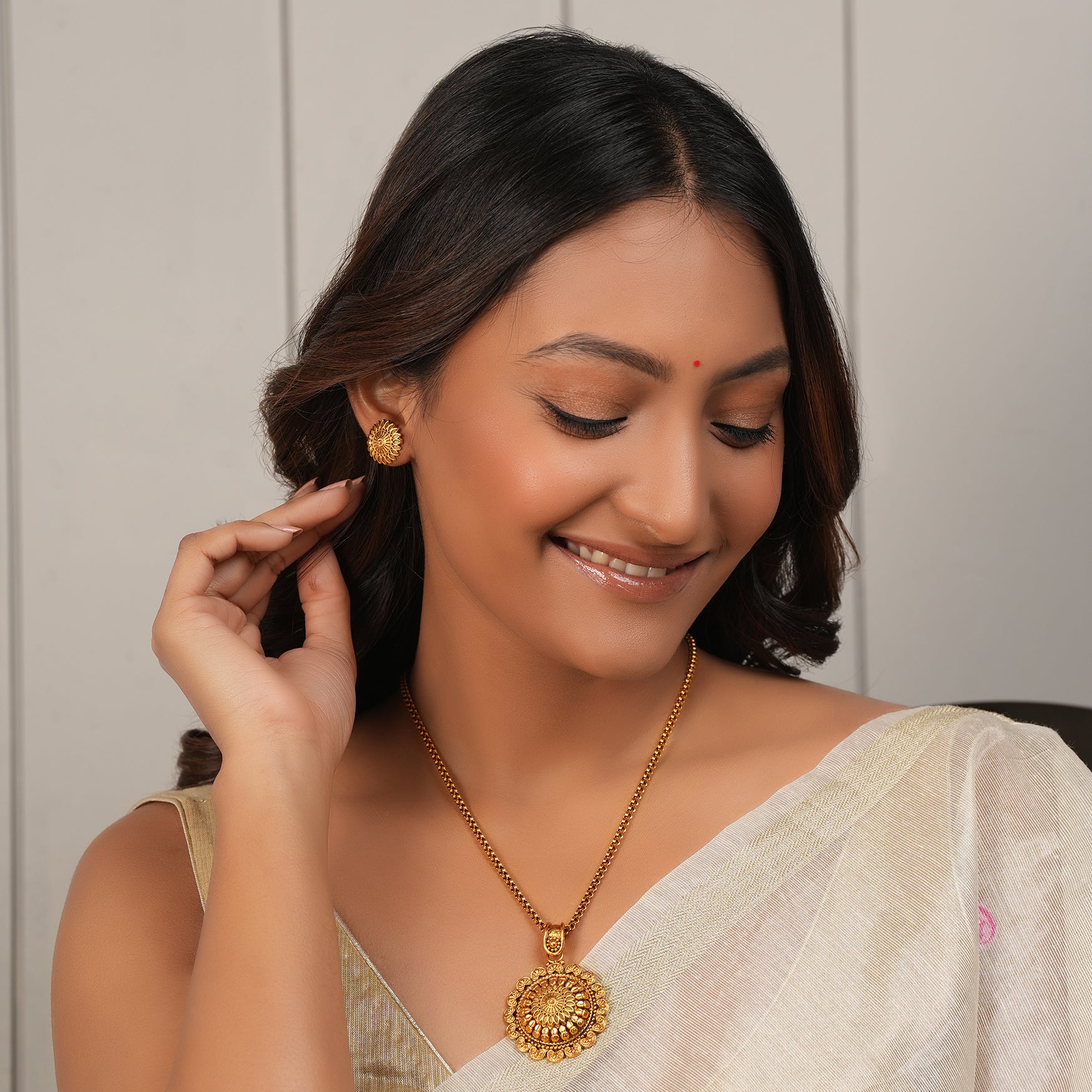 NOTE: This Stunning broad antique gold floral pendant set with stud earring has been crafted by hand and may have slight irregularities or imperfections in color or embellishment. These irregularities are the result of human involvement in the process and add to the finished product's charm while ensuring you have a one-of-a-kind piece.