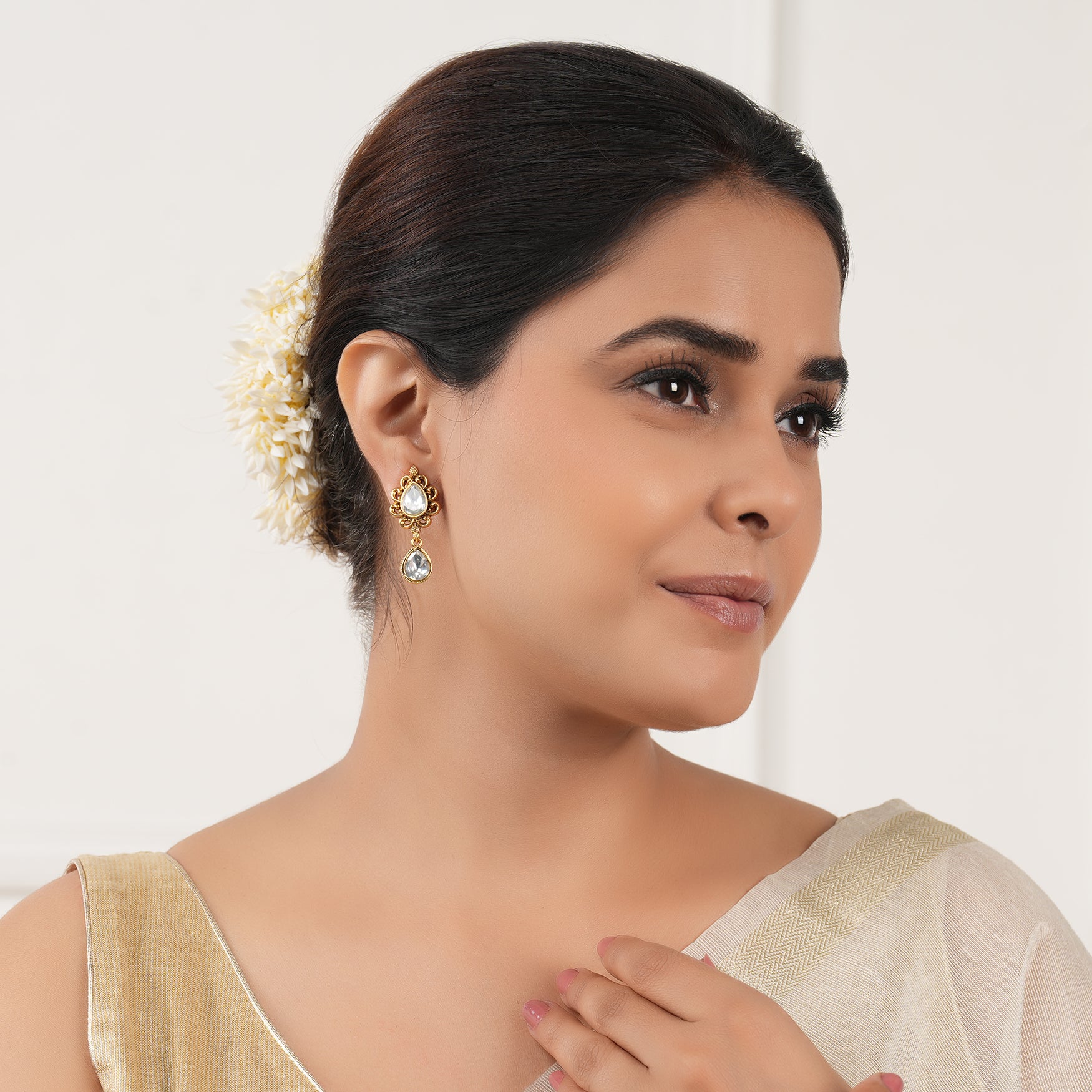 Stunning antique gold kundan earring  for women is made of brass alloy with gold plating. These earrings are 1.5 inch long, and the lock is push back.