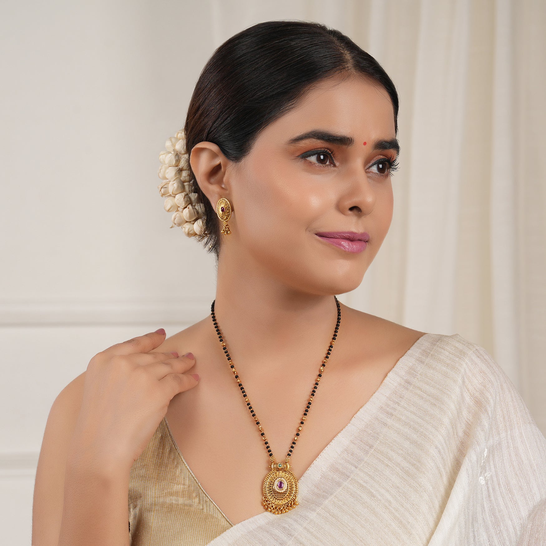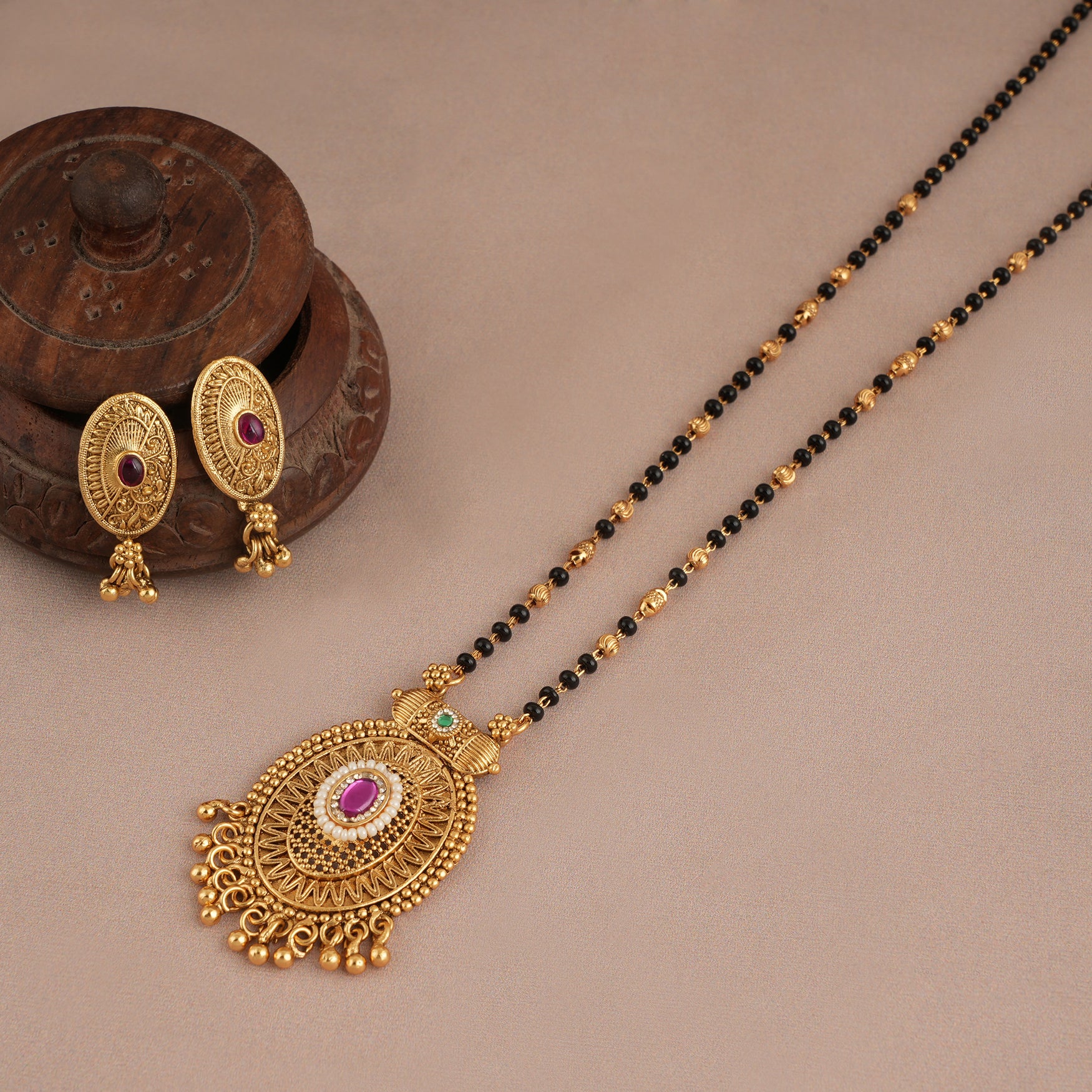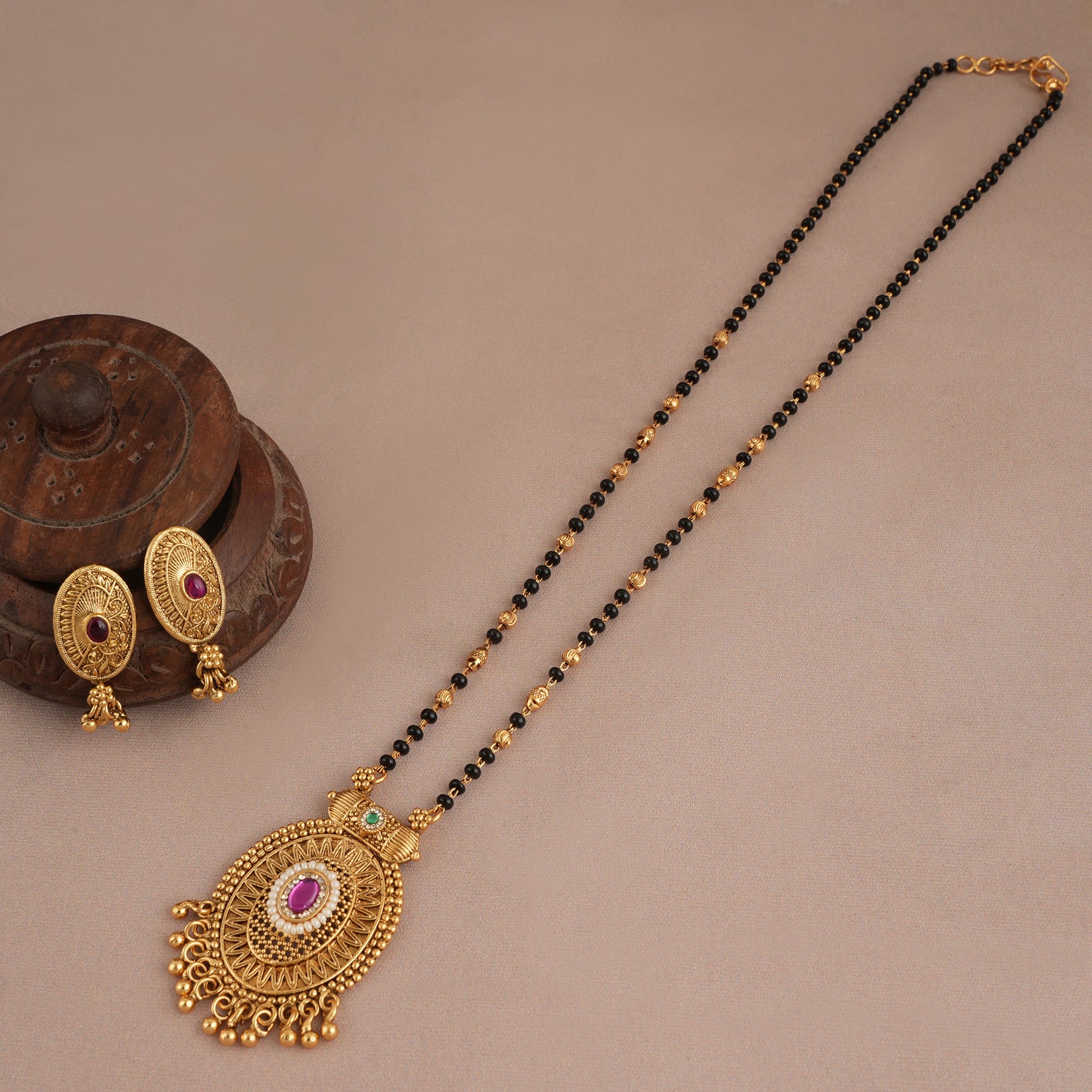Stunning delicate antique gold mangalsutra set   is made of brass alloy with gold plating. The necklace length is 20 inches and the necklace lock is hook. The earrings are 1.2 inches long, and its lock is a push-back.