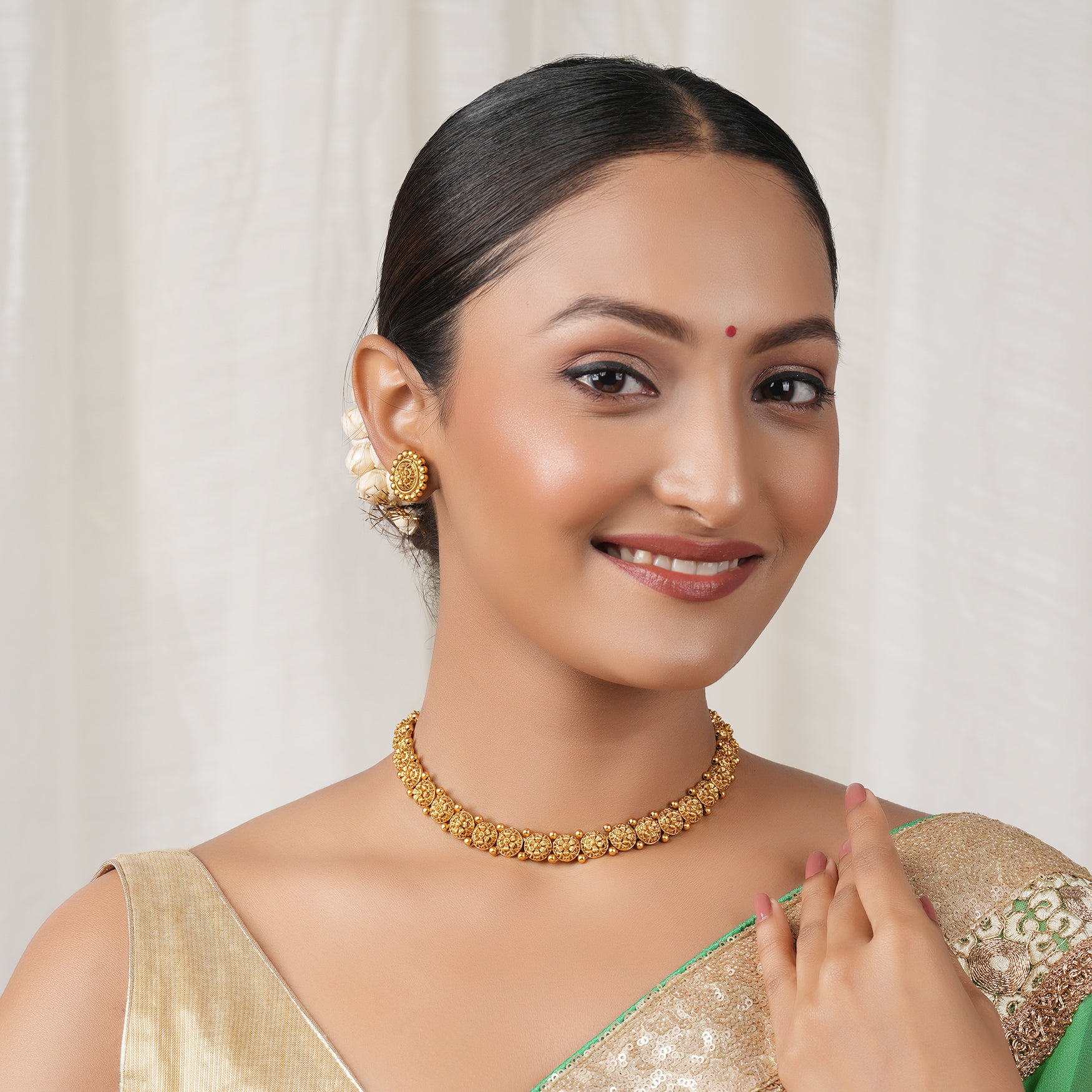 Stunning elegant floral antique gold plain necklace set  are show-stopping and come in traditional Indian design with gold plating and handwork.