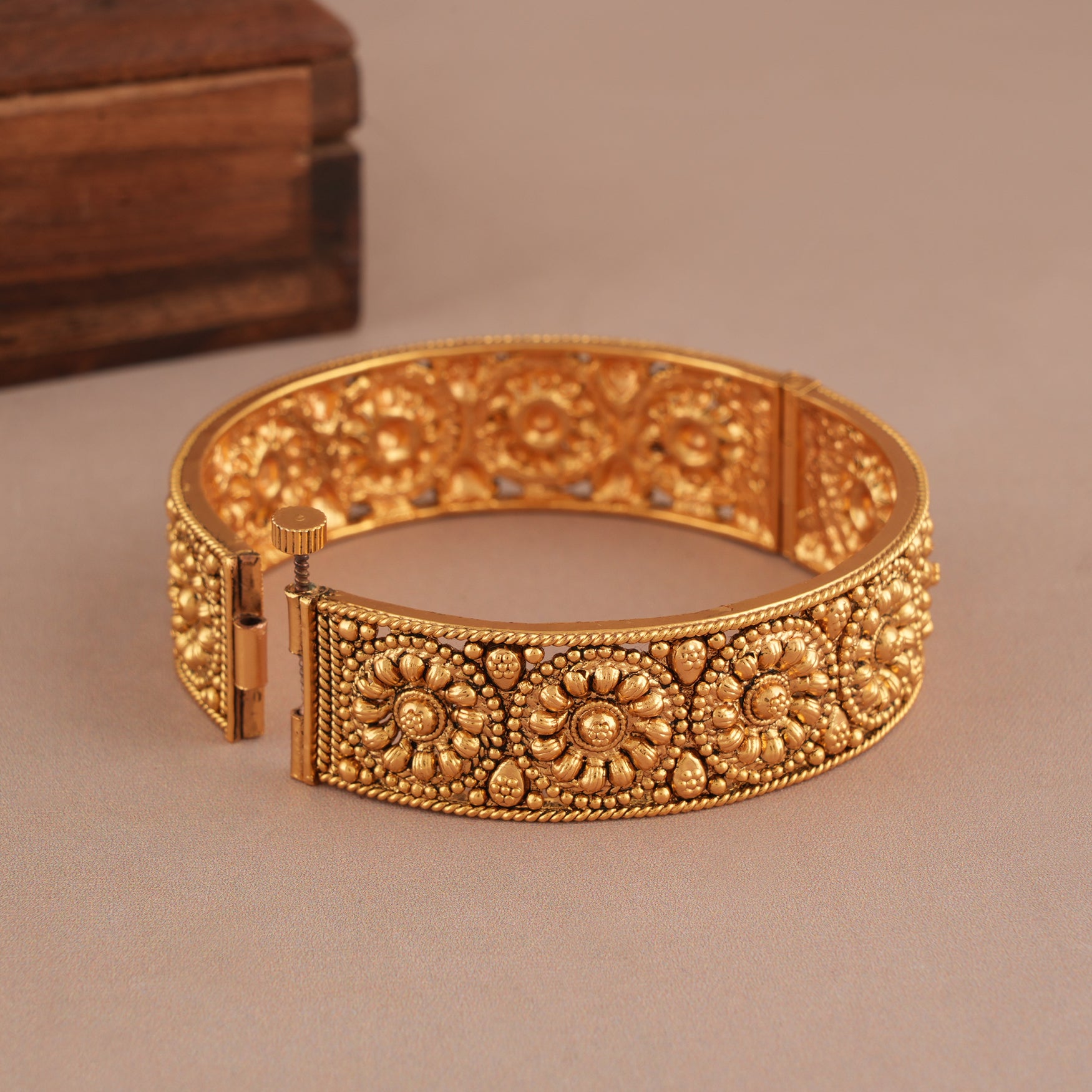 Stunning floral antique gold kada bangle for women is a timeless piece that will provide you with years of beautiful wear. This Stunning floral antique gold kada bangle is show-stopping and comes in traditional Indian design with gold plating and handwork. Buy Stunning floral antique gold kada bangle online and get free shipping even on Cash on Delivery