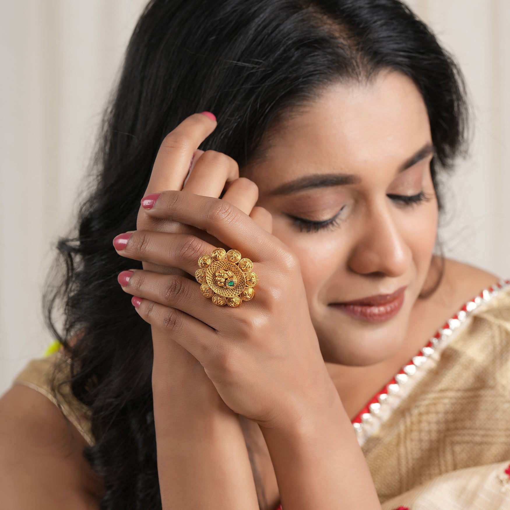 Stunning high gold floral finger ring is a timeless piece that will provide you with years of beautiful wear. The metal-brass alloy with gold plating is made to last.