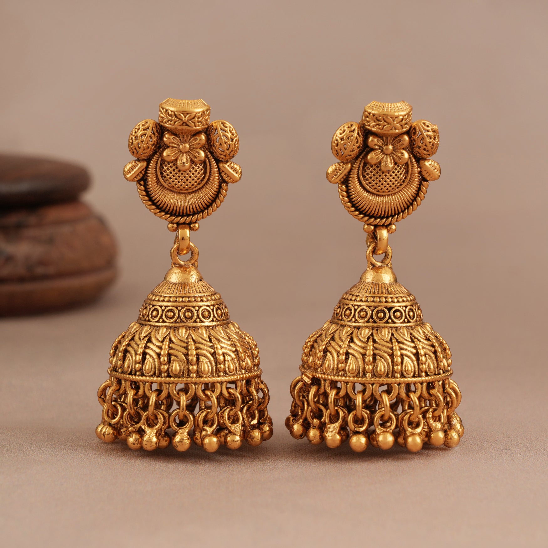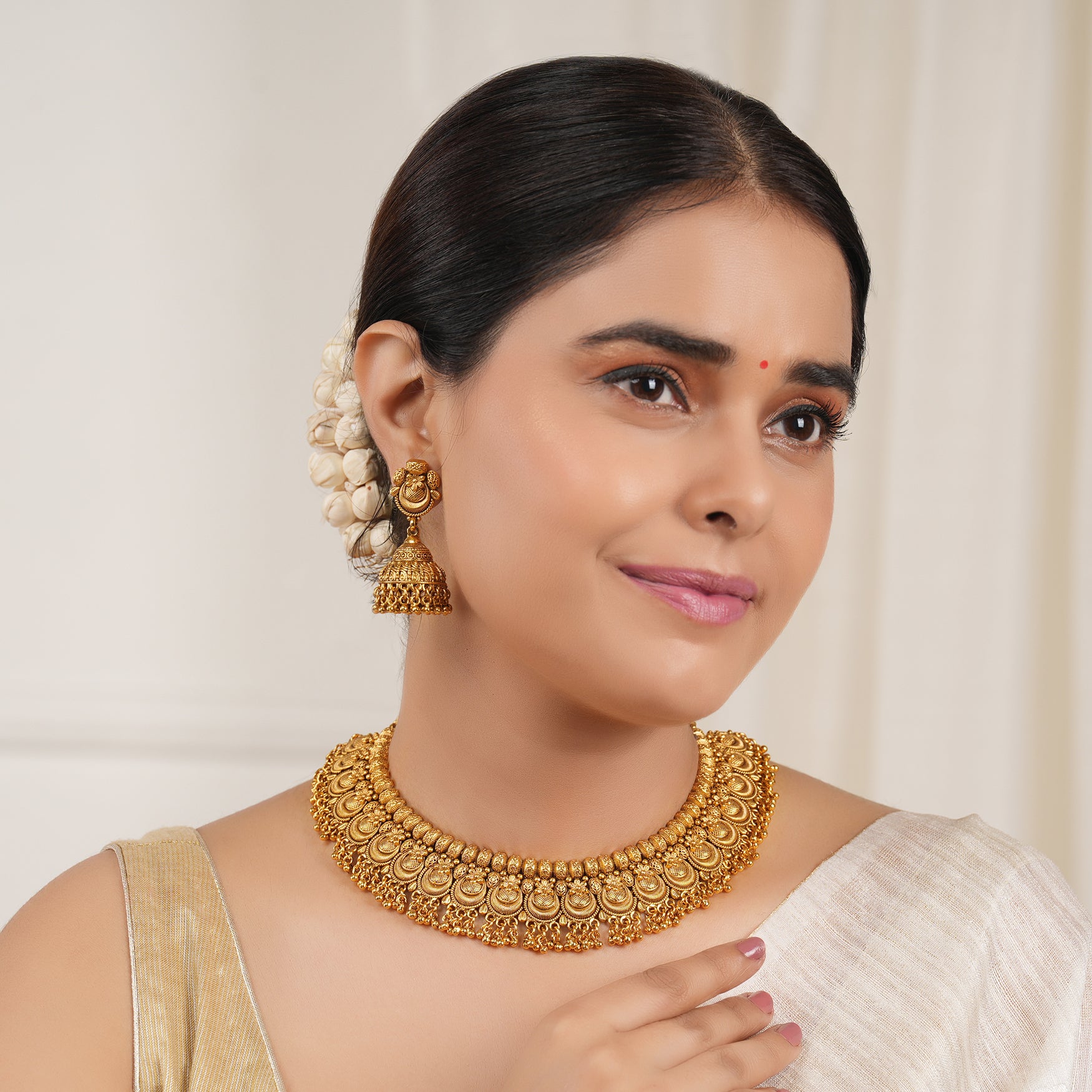 Stunning intricate antique gold plain necklace set with jhumka earring for women  are show-stopping and come in traditional Indian design with gold plating and handwork.