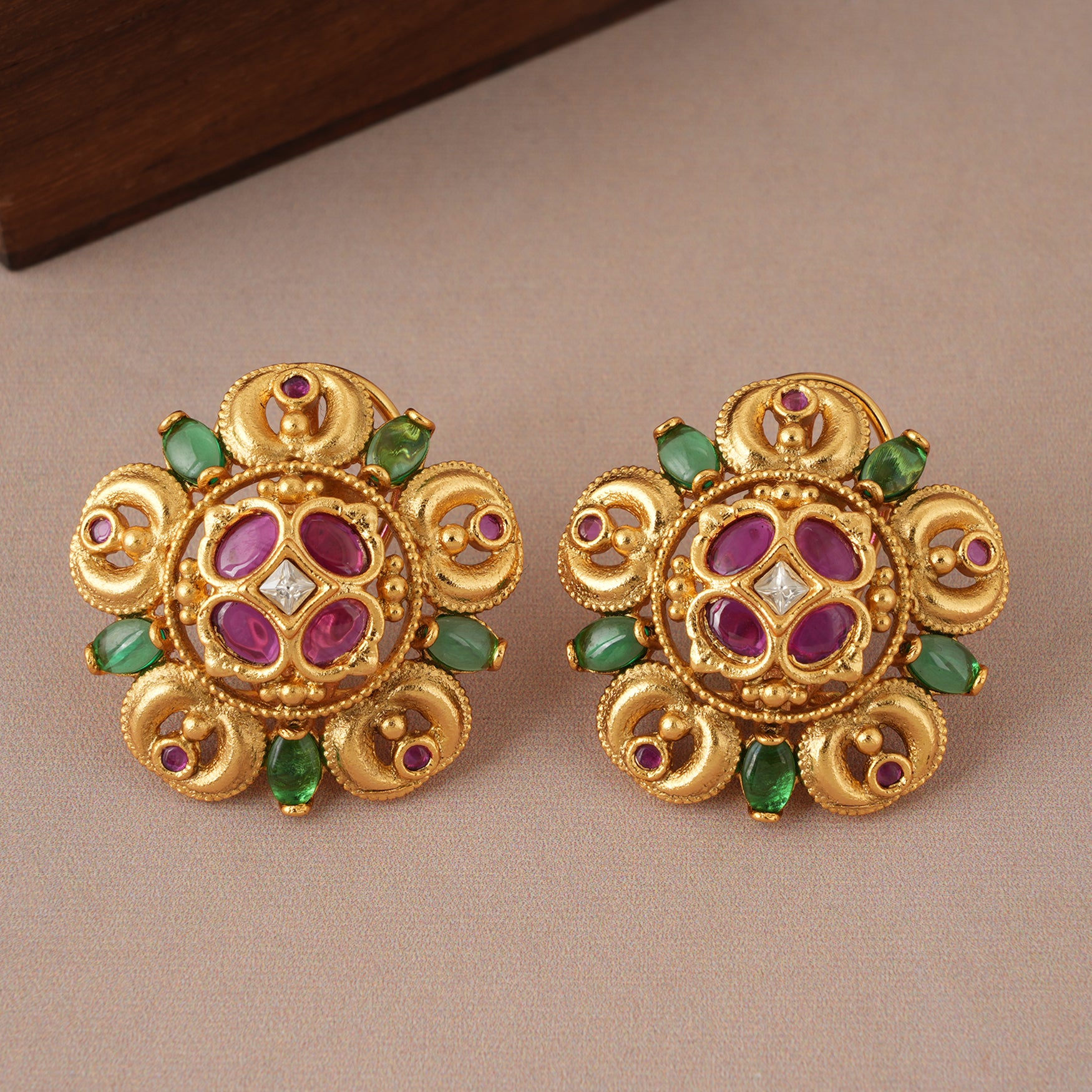 NOTE: These Stunning multicolor antique gold stud earrings have been crafted by hand and may have slight irregularities or imperfections in color or embellishment. These irregularities are the result of human involvement in the process and add to the finished product's charm while ensuring you have a one-of-a-kind piece.