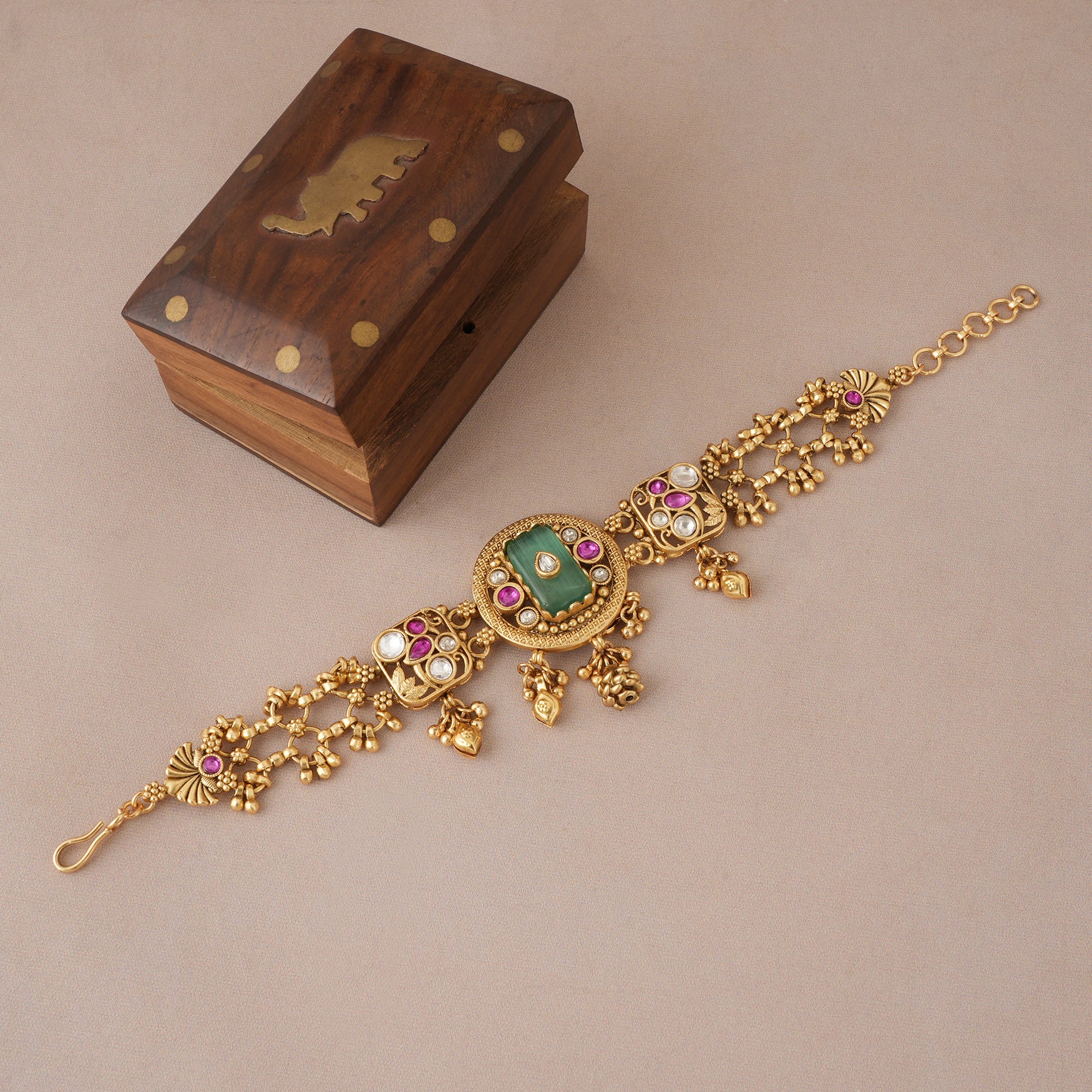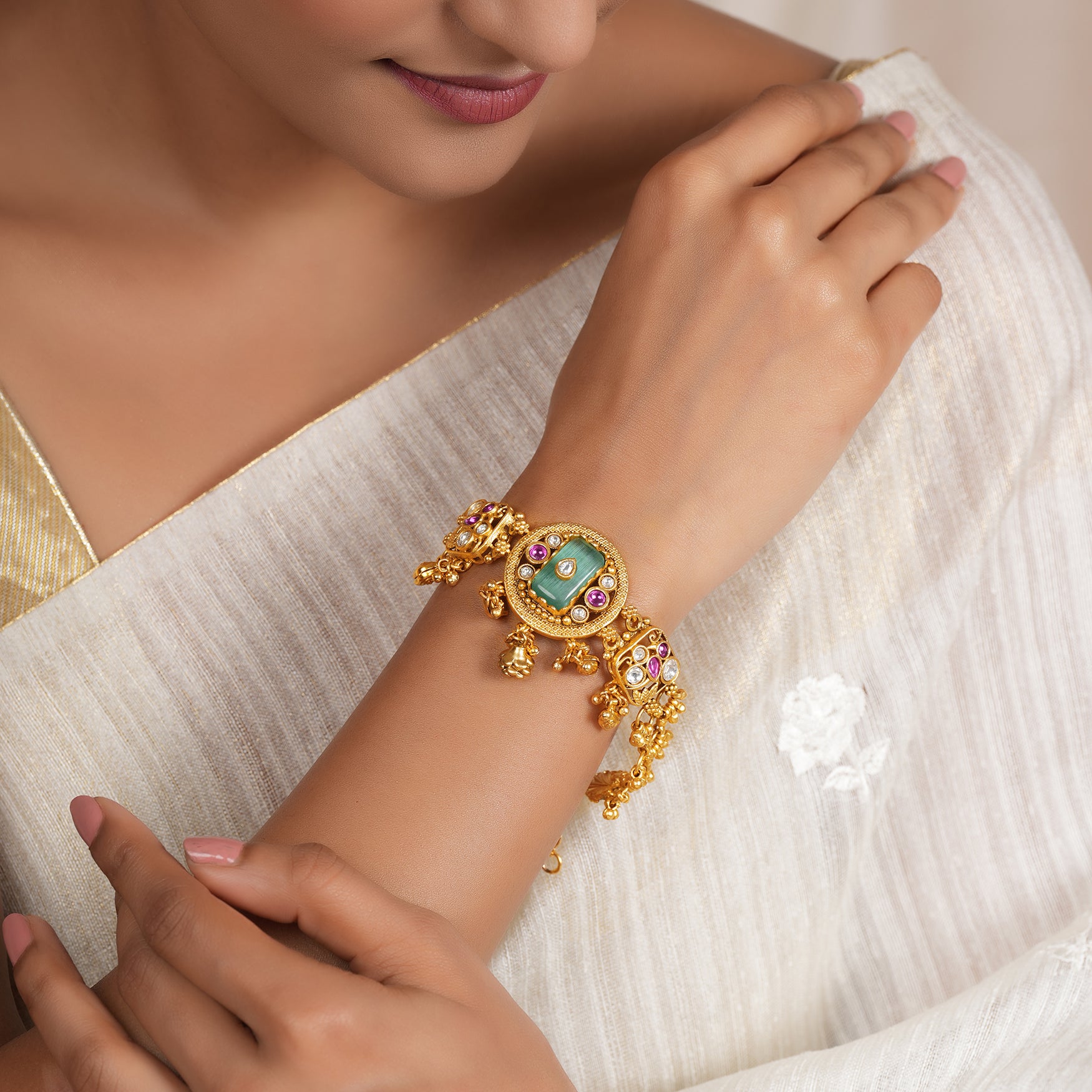 NOTE: This Buy this Stunning multicolor kundan antique gold bracelet  has been crafted by hand and may have slight irregularities or imperfections in color or embellishment. These irregularities are the result of the human involvement in the process and add to the finished product's charm while ensuring you have a one-of-a-kind piece.