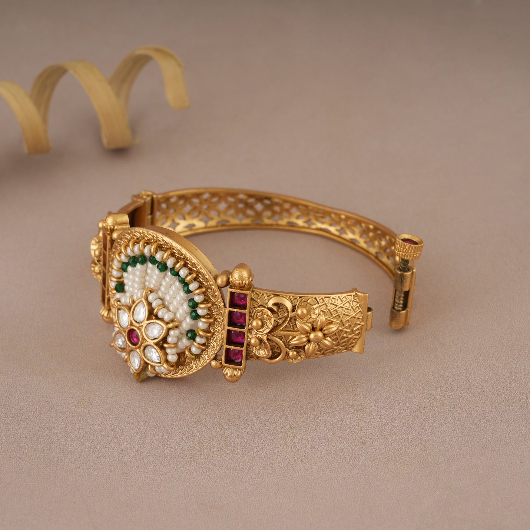 The metal-brass alloy with gold plating is made to last, while the Synthetic stones and pearls give the bangle a touch of unmatched elegance.