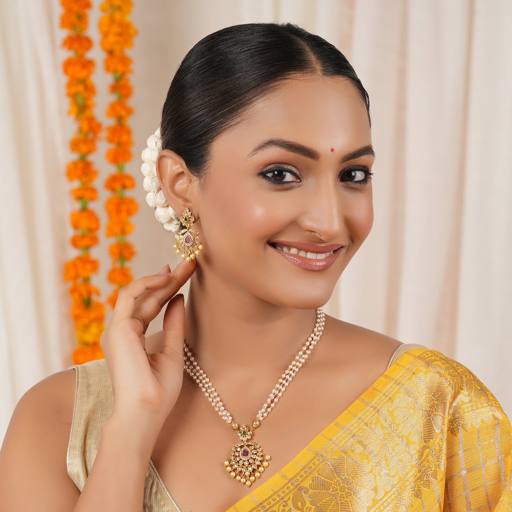 This set comes with beautiful pair of matching earrings Stunning pearl antique gold stone pendant set is a show-stopping, traditional Indian necklace set with gold plating and handwork.
