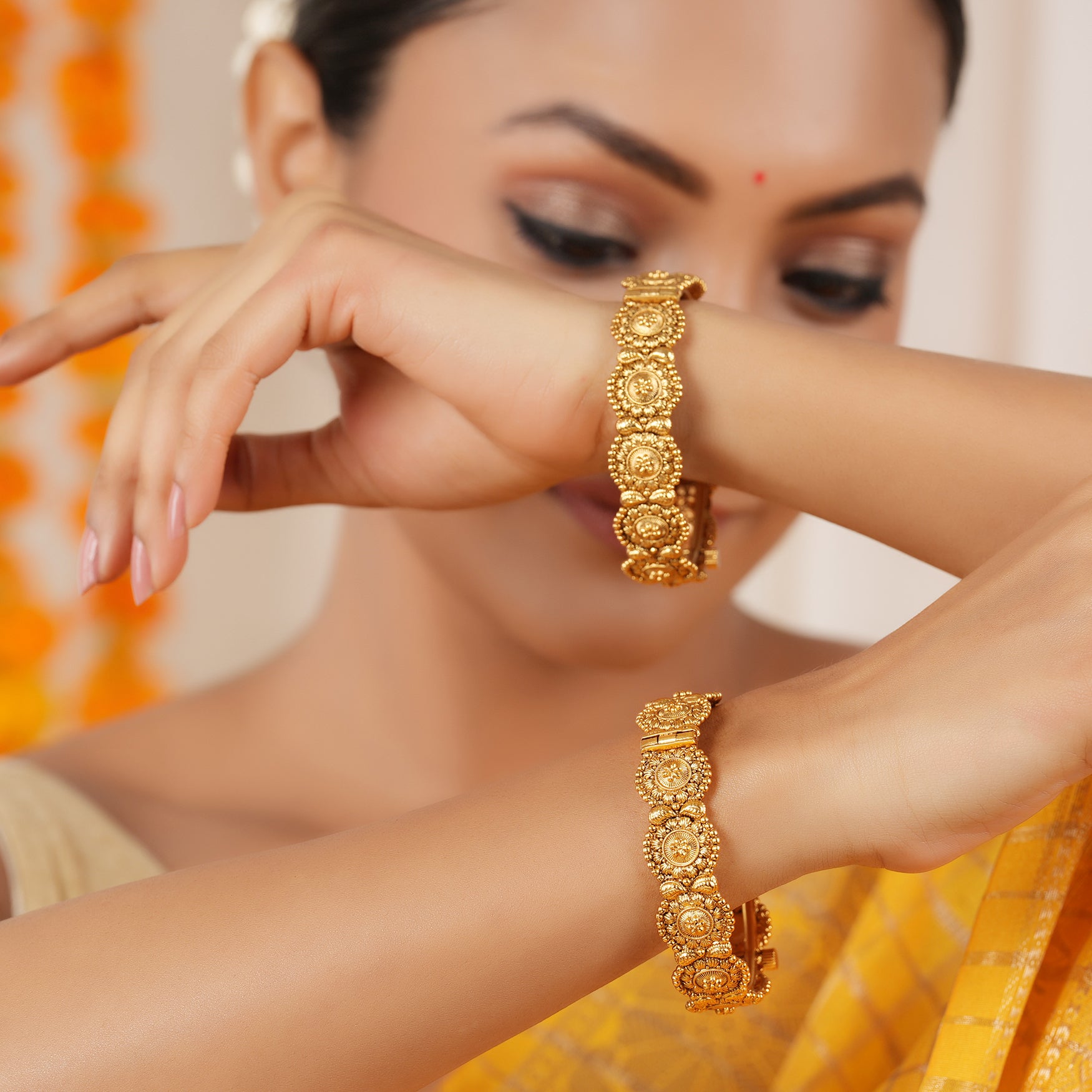 NOTE: This Stunning plain antique gold floral bangle set for women has been crafted by hand and may have slight irregularities or imperfections in color or embellishment.