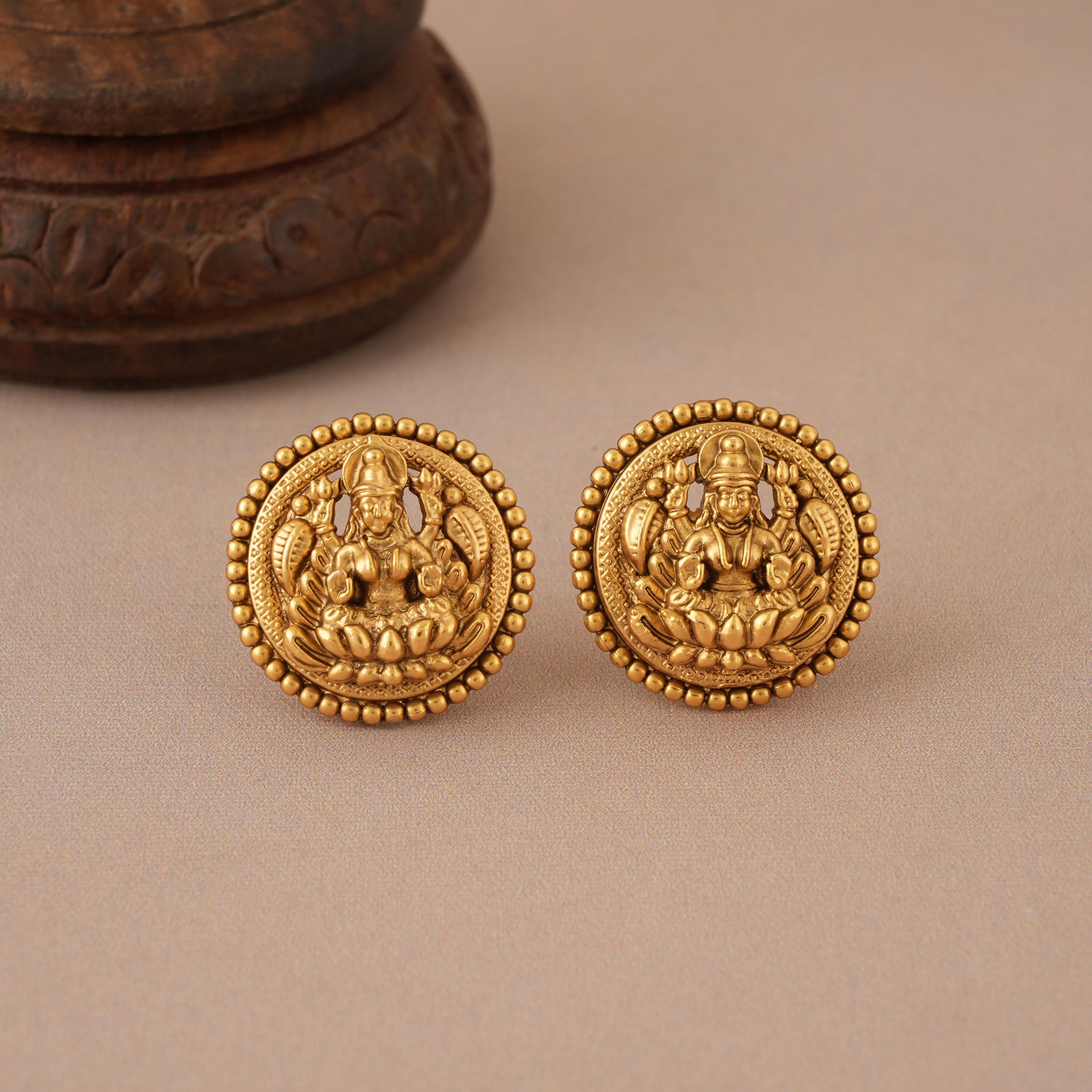 NOTE: These Stunning plain antique gold maa lakshmi traditional stud earring  have been crafted by hand and may have slight irregularities or imperfections in color or embellishment. These irregularities are the result of human involvement in the process and add to the finished product's charm while ensuring you have a one-of-a-kind piece.