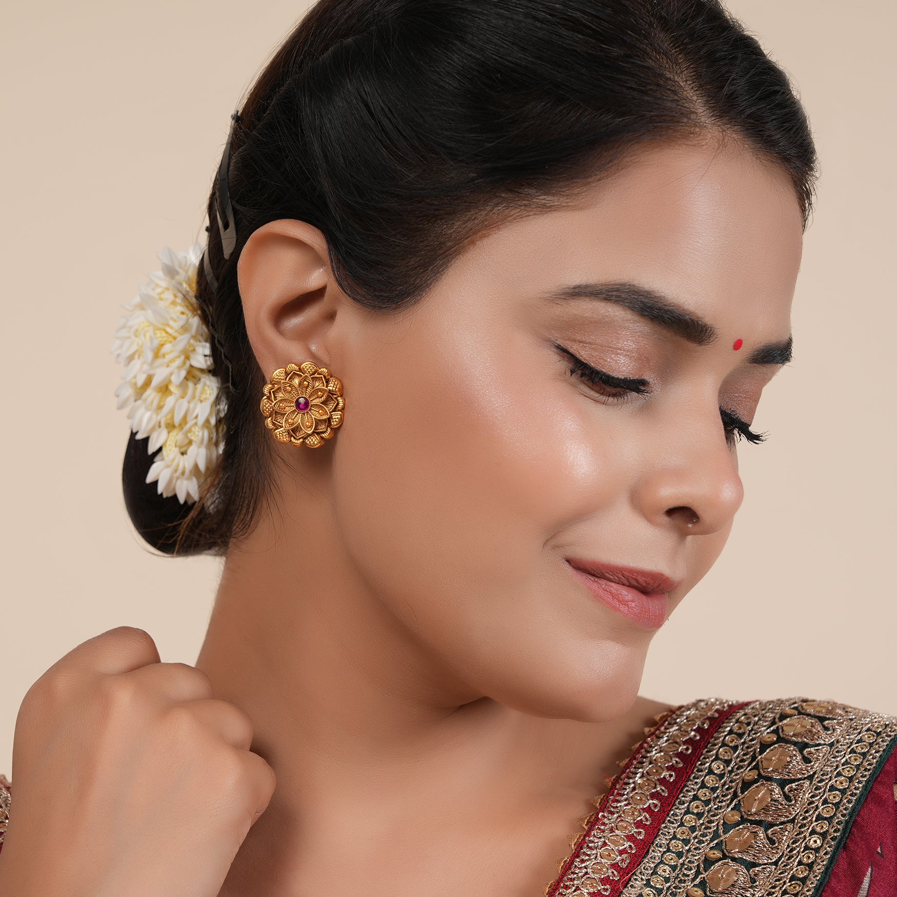 NOTE: These Stunning red stone antique gold stud earring for women have been crafted by hand and may have slight irregularities or imperfections in colour or embellishment. These irregularities are the result of human involvement in the process and add to the finished product's charm while ensuring you have a one-of-a-kind piece.
