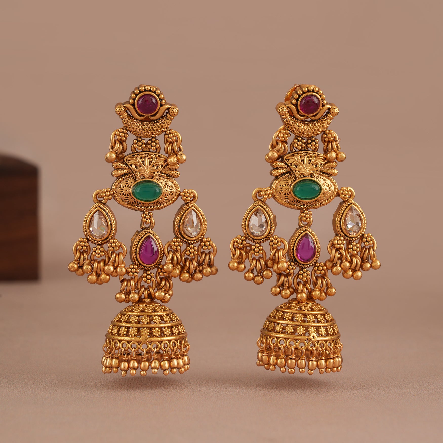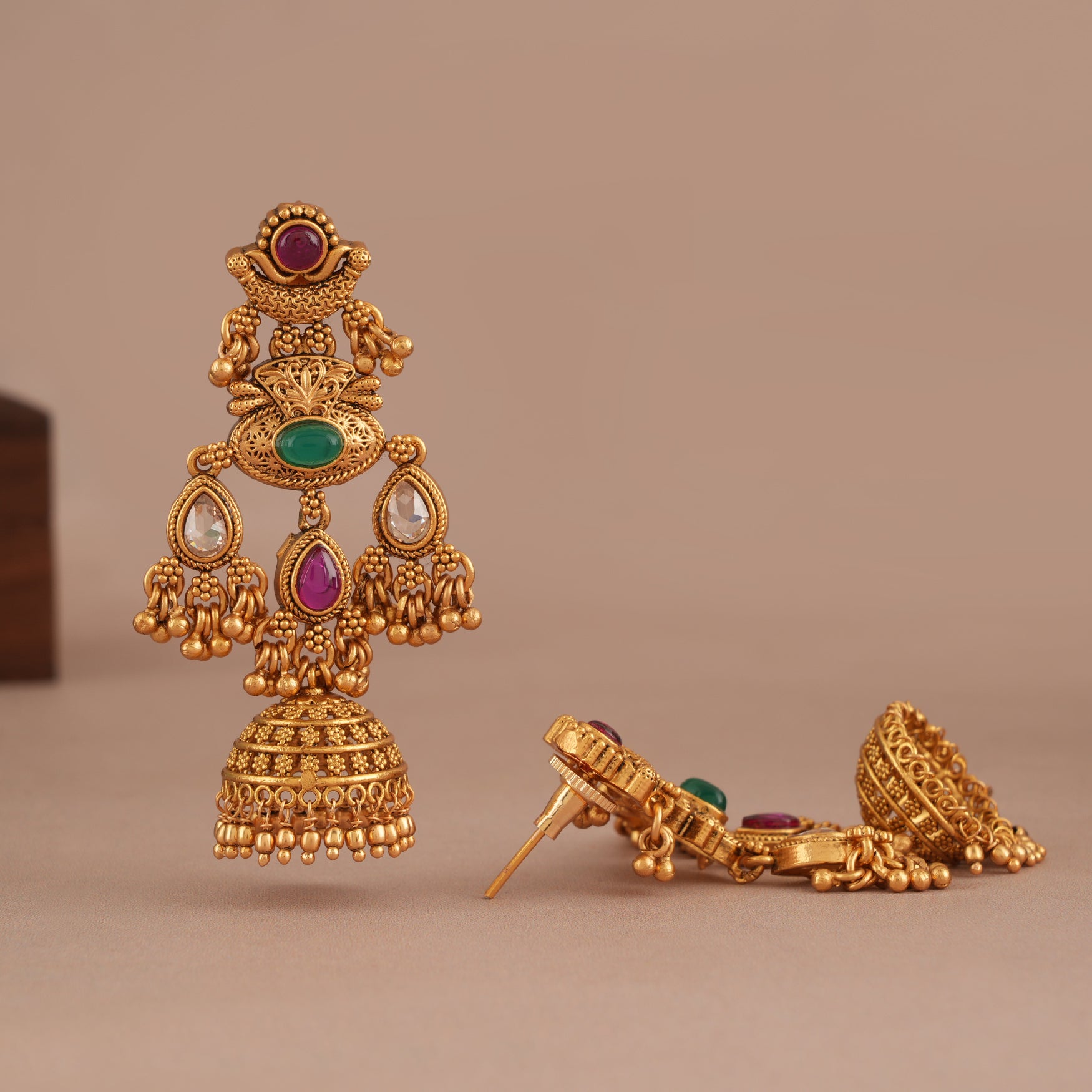 NOTE: These Stunning stone antique gold jhumka earring have been crafted by hand and may have slight irregularities or imperfections in color or embellishment. These irregularities are the result of human involvement in the process and add to the finished product's charm while ensuring you have a one-of-a-kind piece.