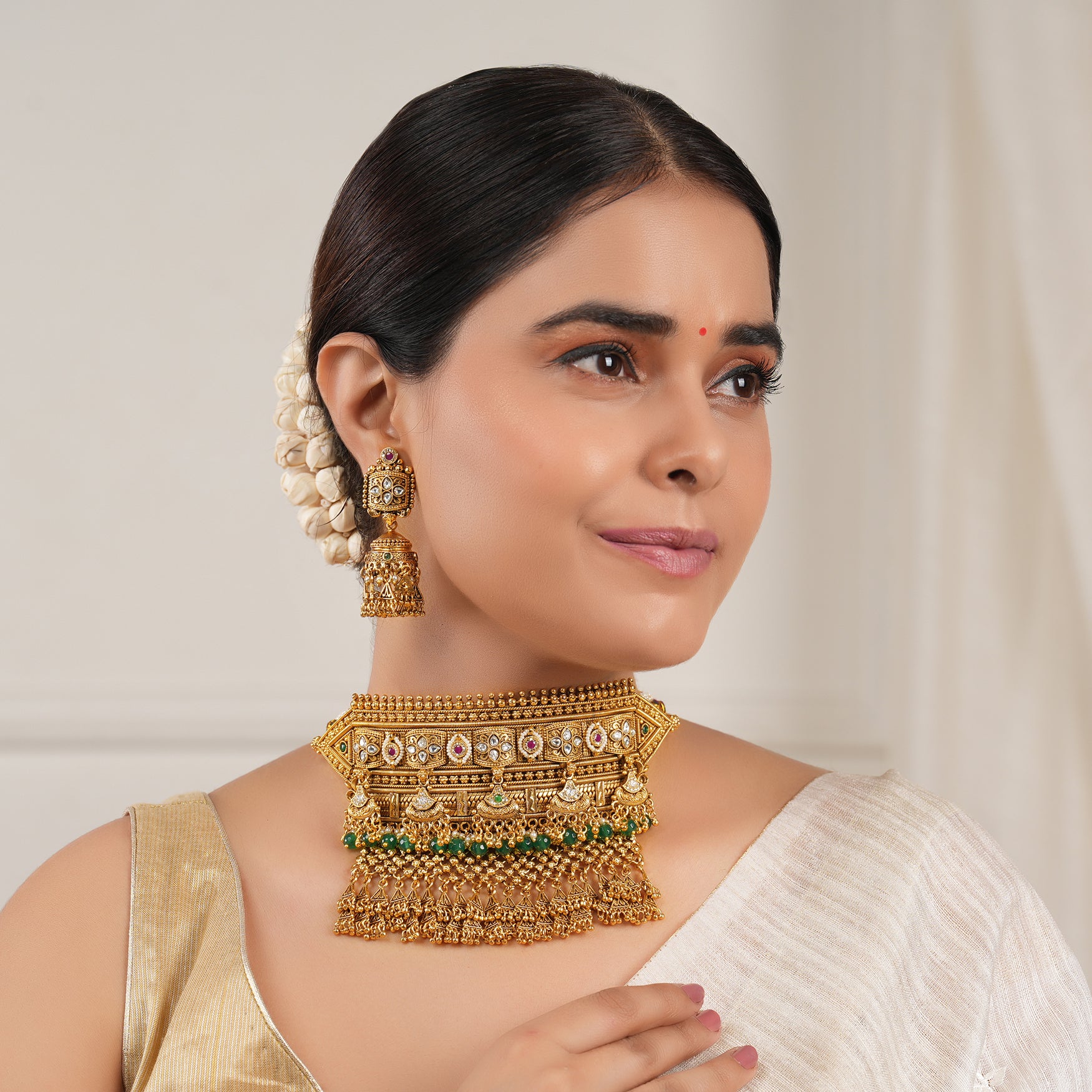 NOTE: Traditional antique gold multicolor kundan choker necklace set  is has been crafted by hand and may have slight irregularities or imperfections in color or embellishment. These irregularities are the result of human involvement in the process and add to the finished product's charm while ensuring you have a one-of-a-kind piece.