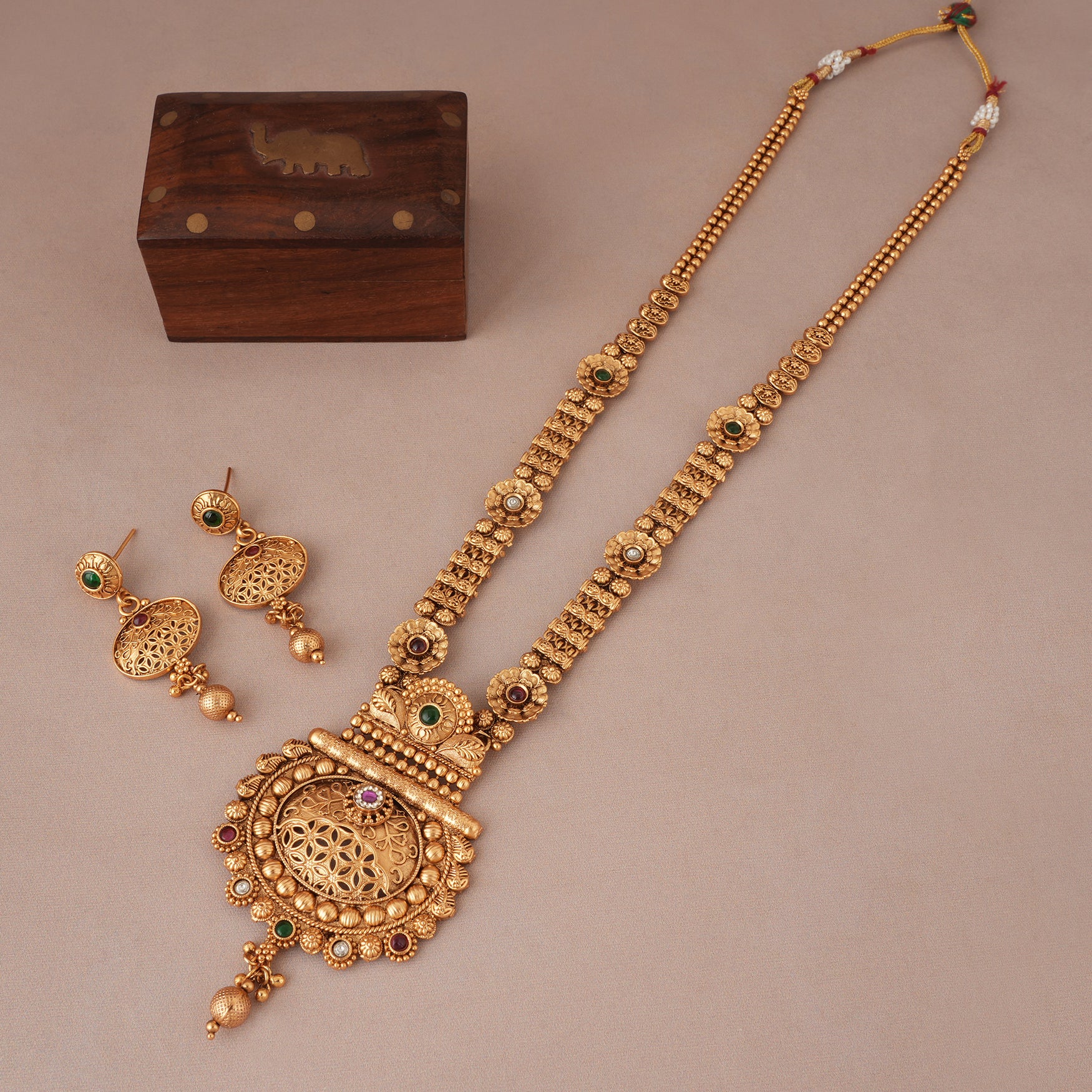 NOTE: Traditional stone antique gold long necklace set  has been crafted by hand and may have slight irregularities or imperfections in color or embellishment. These irregularities are the result of human involvement in the process and add to the finished product's charm while ensuring you have a one-of-a-kind piece.